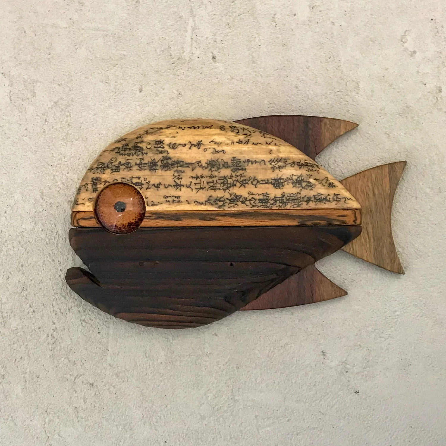 The type on this guy is from a page taken out of an old Japanese rice paper book, decoupaged onto the fish.  His lower half is, fittingly, made from a process called “Sho Sugi Ban,” a treatment with fire was used to waterproof wood.