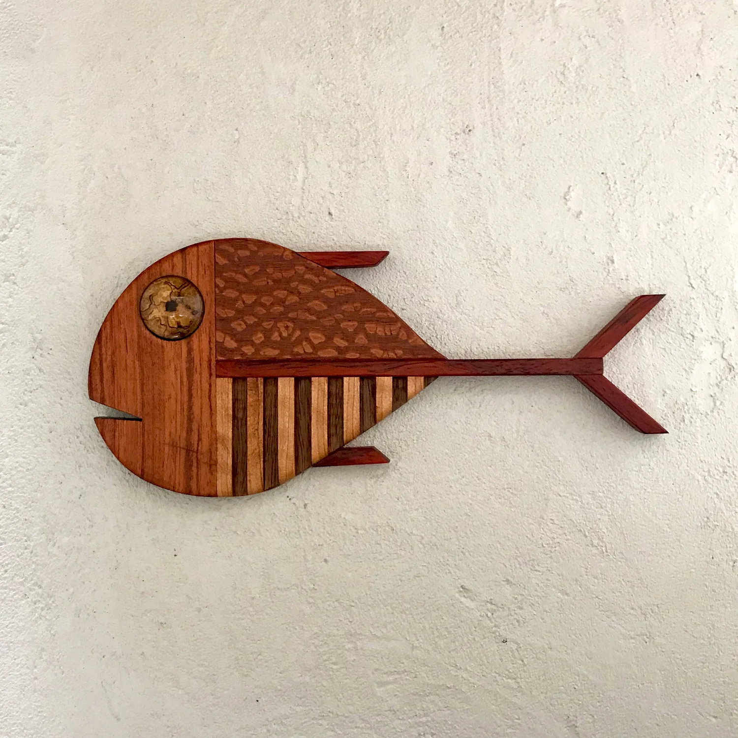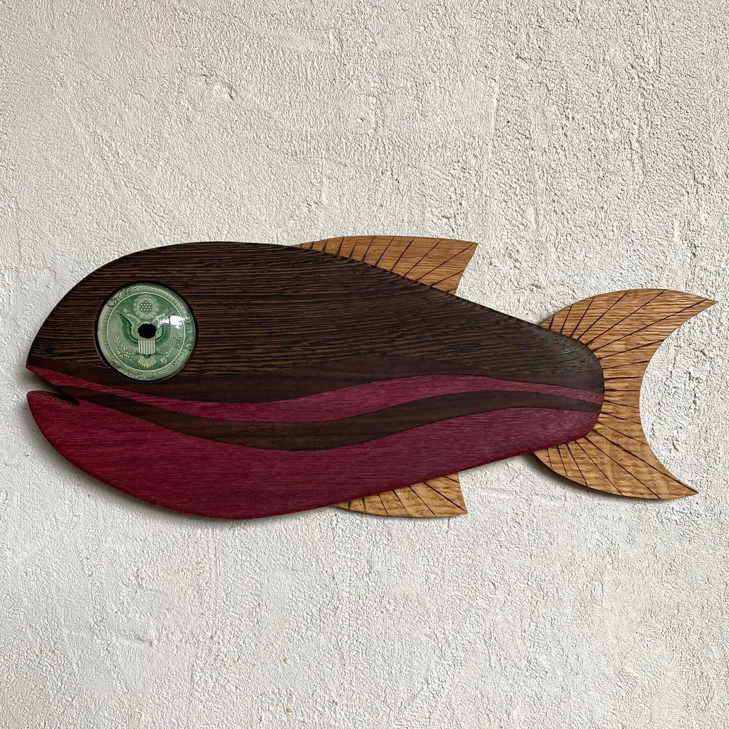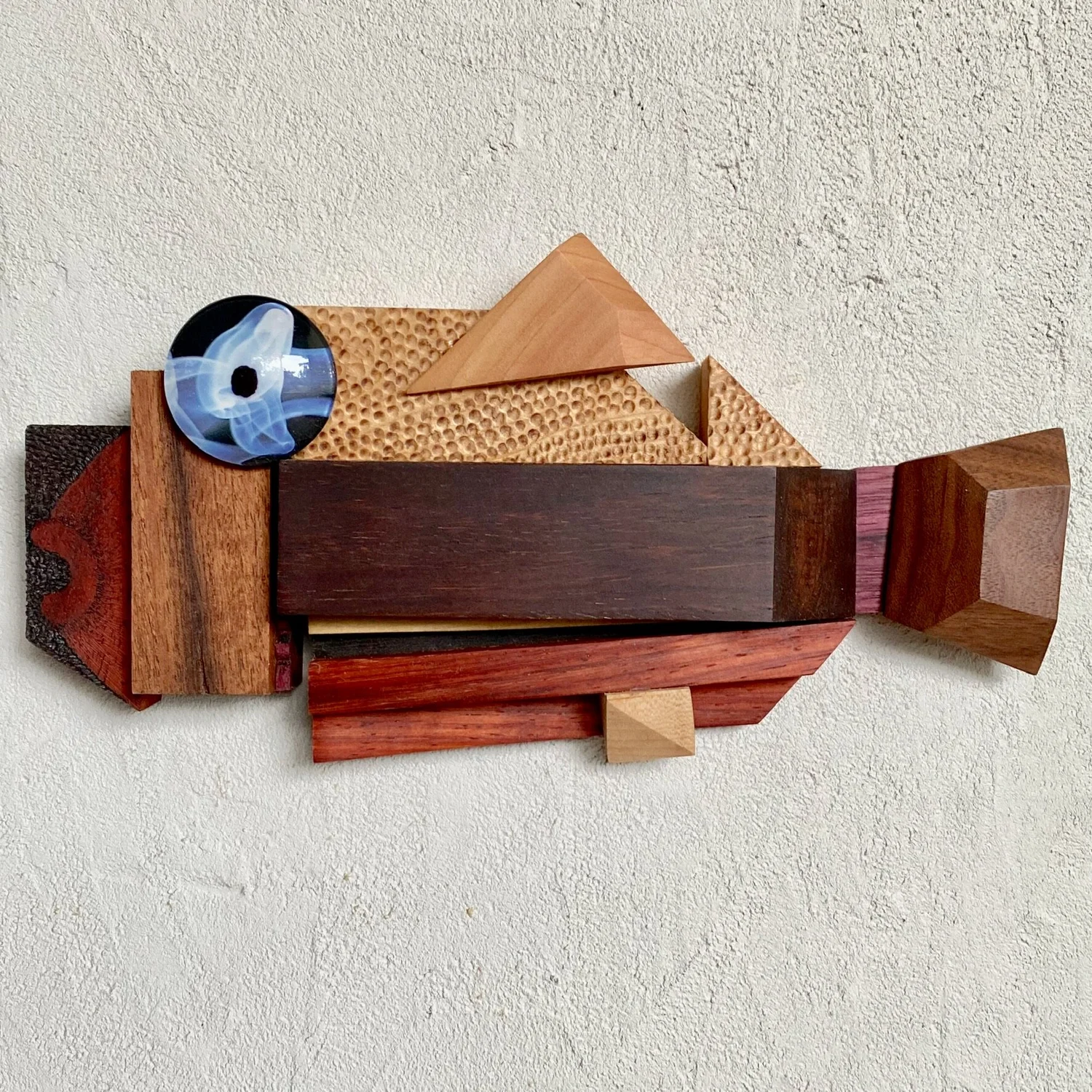 This Mid-Century Modern fish is made from exotic woods including Wenge, Padauk and Canary Wood.