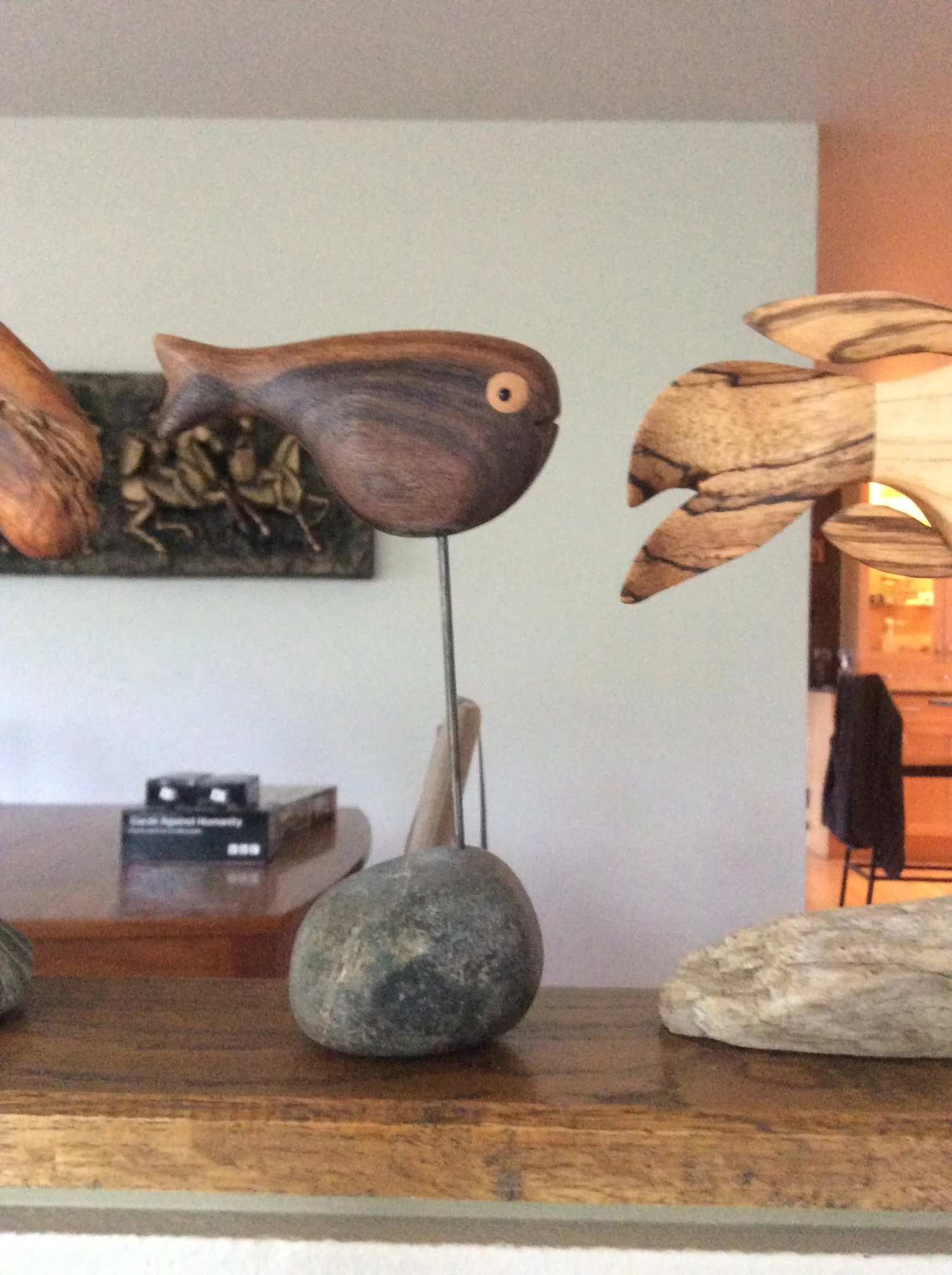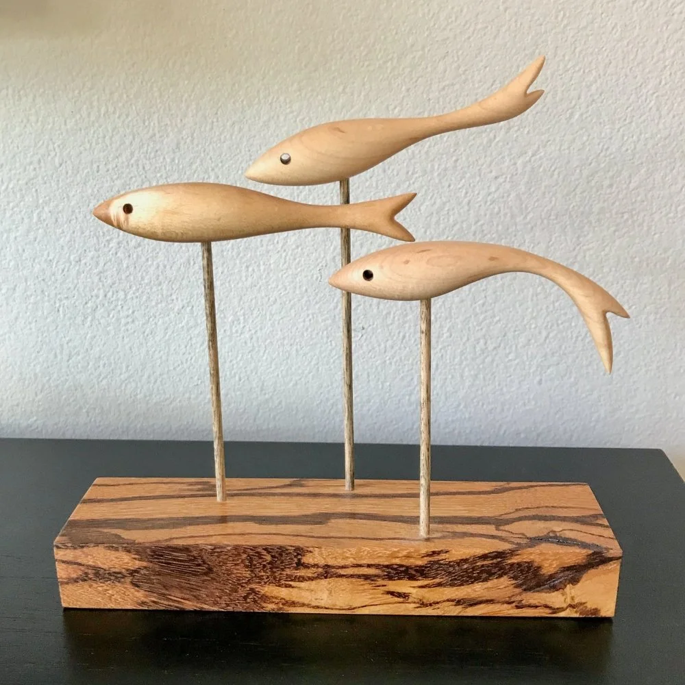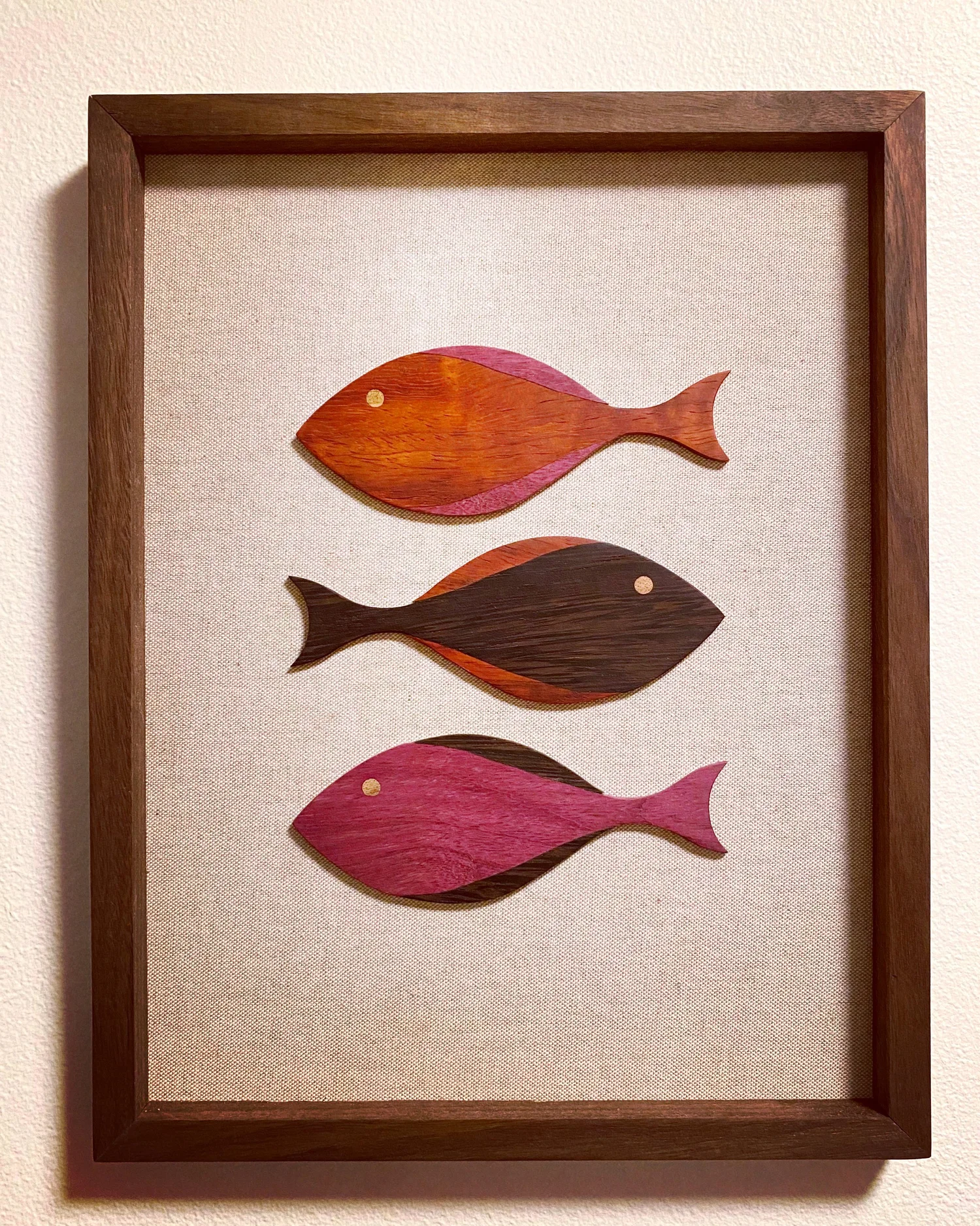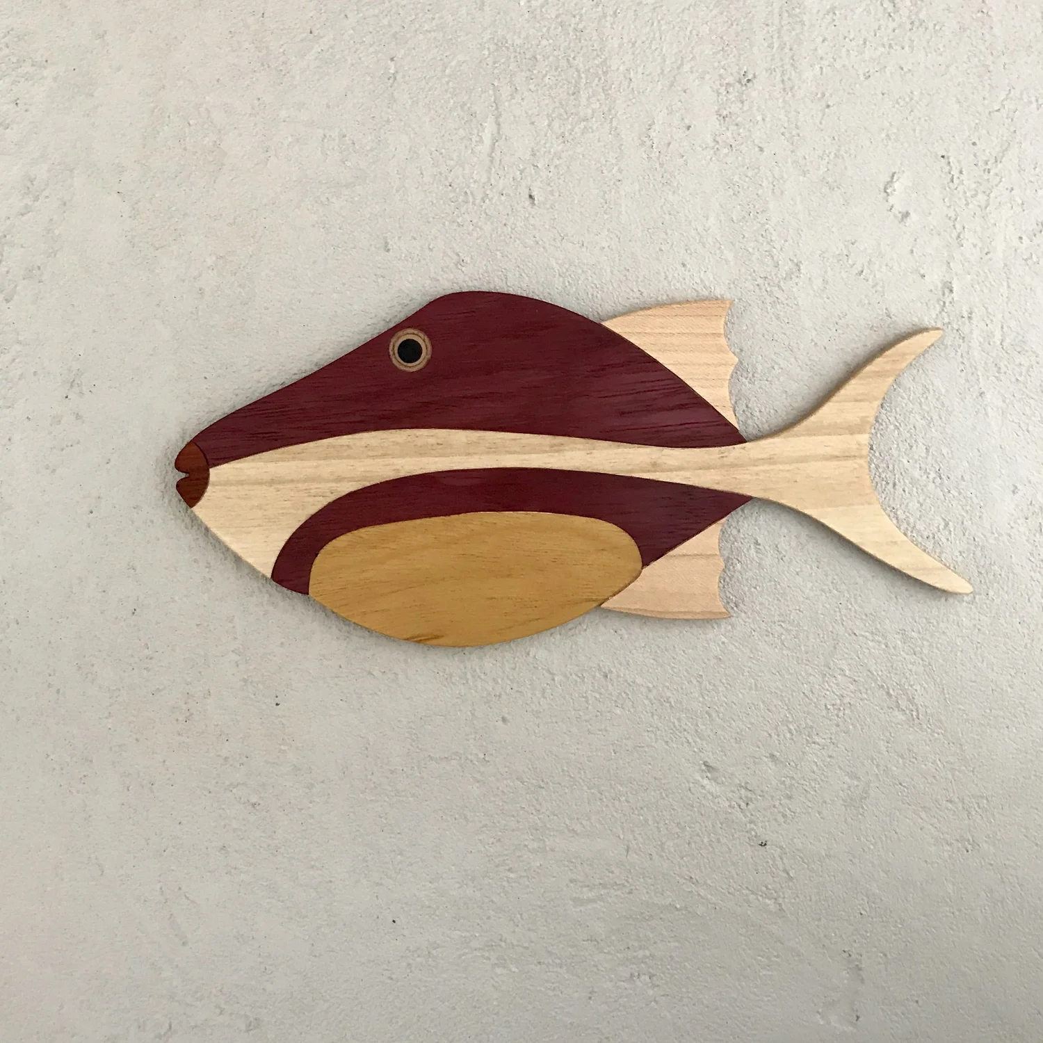 This Mid-Century Modern fish is made from exotic woods including Wenge, Padauk and Canary Wood.