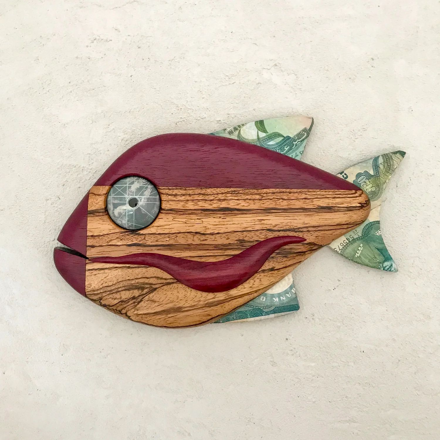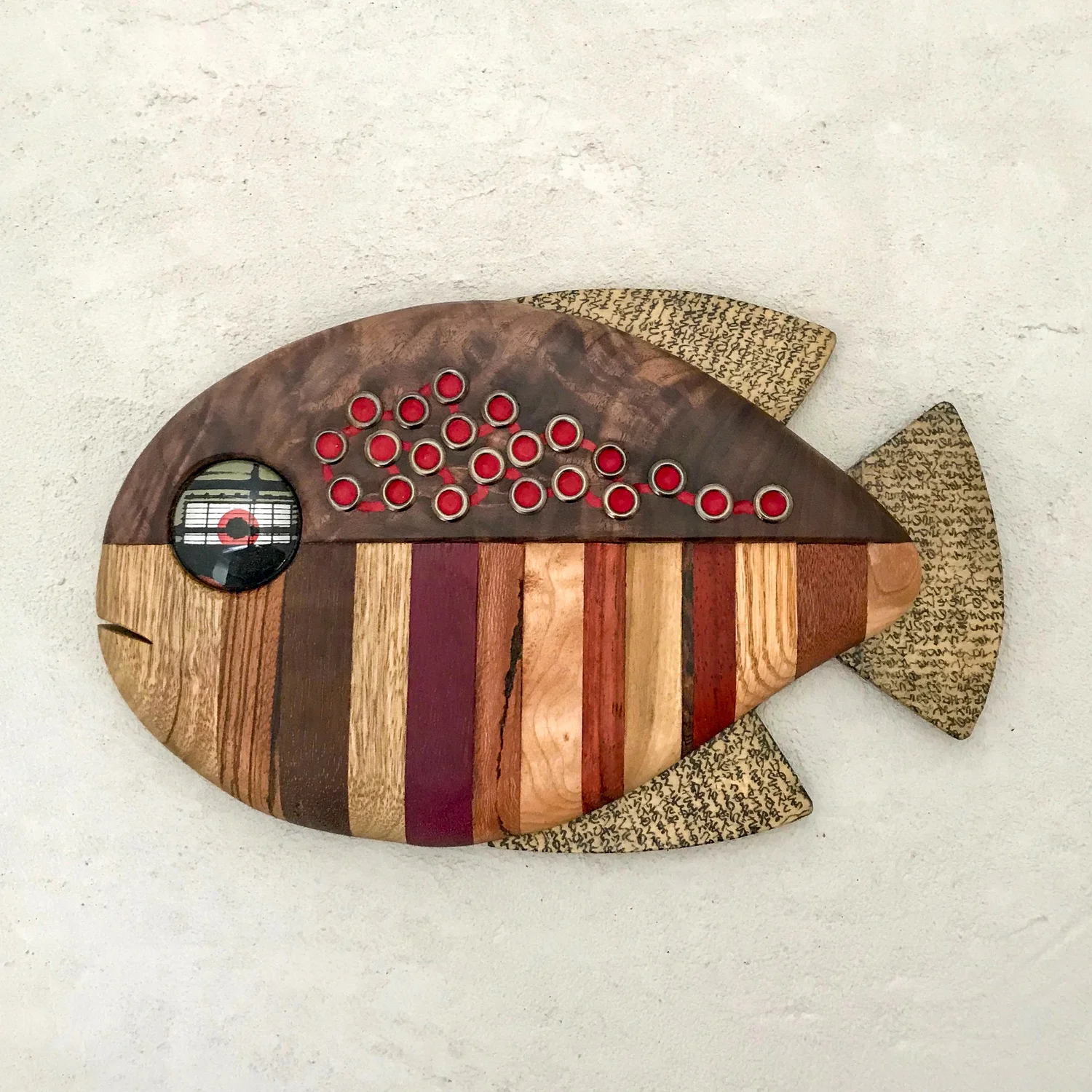 This gorgeous fish is made primarily from Black Limba and Padauk exotic woods, featuring a bright orange glass eye.